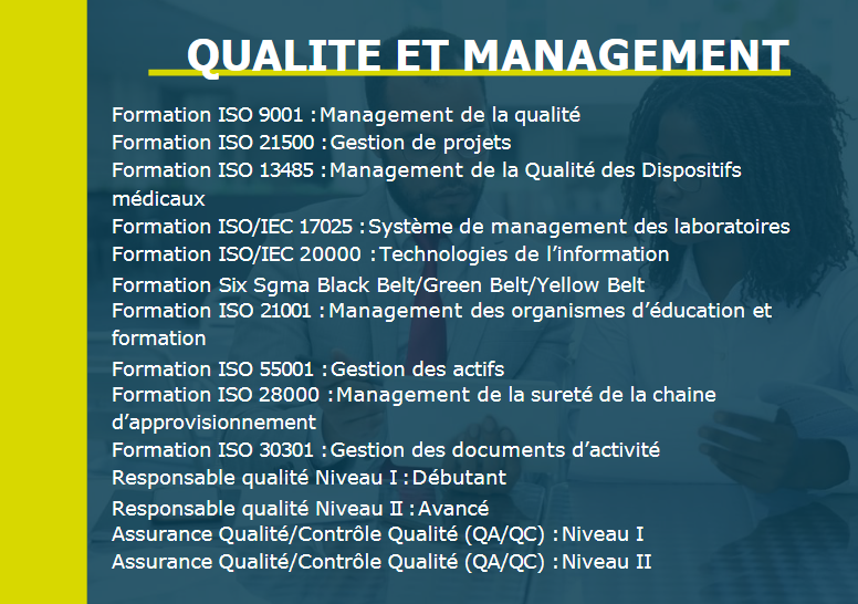 Catalogue de formations opérationnelles couvrant les domaines critiques du QHSE, de la RSE, de la cybersécurité, de l'entrepreneuriat, de la santé et sécurité, ainsi que de la gestion, du conseil et de l'audit. Des programmes conçus pour transformer le savoir en compétences applicables immédiatement. Développez les talents en interne pour un retour sur investissement optimal.
